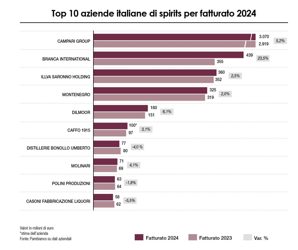 Il 2024 si è dimostrato nuovamente un anno complesso per il mondo degli spiriti anche se le prime 10 aziende italiane del settore per fatturato hanno registrato risultati complessivamente in crescita, soprattutto Campari Group, Branca International e Illva Saronno Holding.